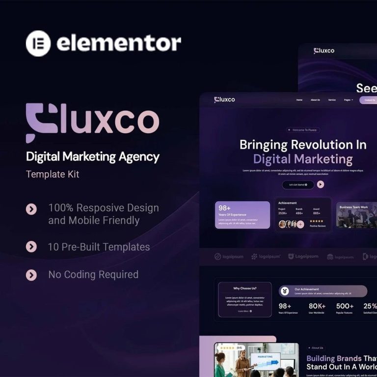 Digicraze is a dark-styled Elementor template kit designed for digital marketing agencies. It includes over 20 professionally designed templates, featuring 2 distinct homepage variations. With this Elementor template kit, you can create various websites, including those for design agencies, social media marketing, creative portfolios, website analysis, SEO & audit services, graphic design services, digital studios, and other digital agency-related services.